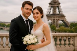“An ultra Hyper Realistic photo of a a newly wed couple posing in Paris France.”