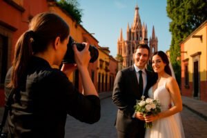 Prompt: “Hyper Realistic photo of a professional female photographer taking a photo shoot at a newly wed couple in San Miguel Allende.”