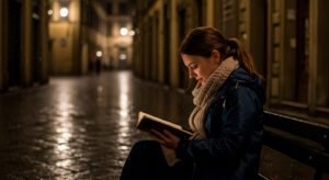 “Retrato de una mujer leyendo bajo la lluvia, luz tenue, estilo documental, fondo de una calle en Florencia”